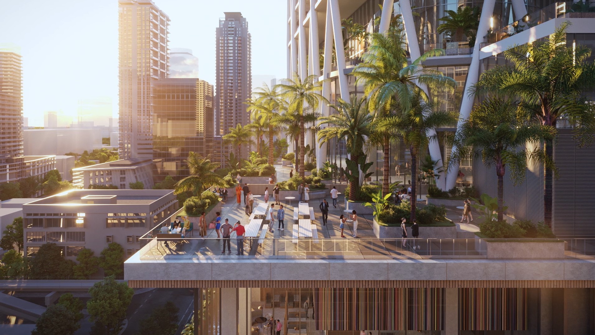 — Sky terrace restaurant with outdoor dining overlooking Brickell Avenue