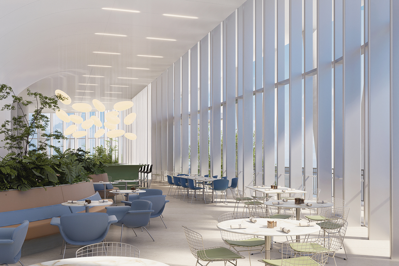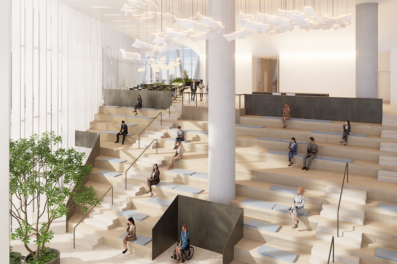 — Outdoor terraces on every office floor promoting indoor–outdoor work environments