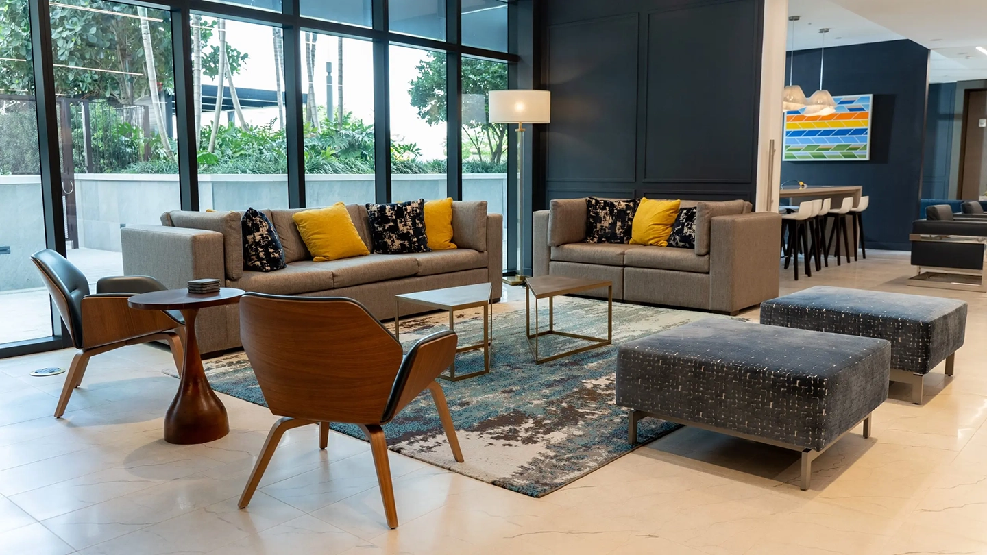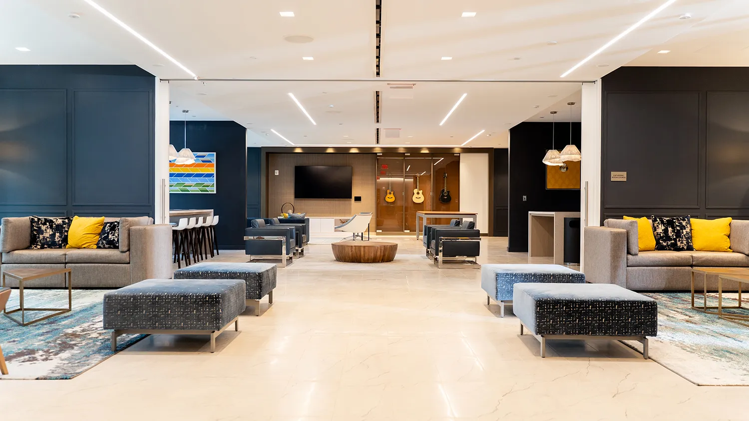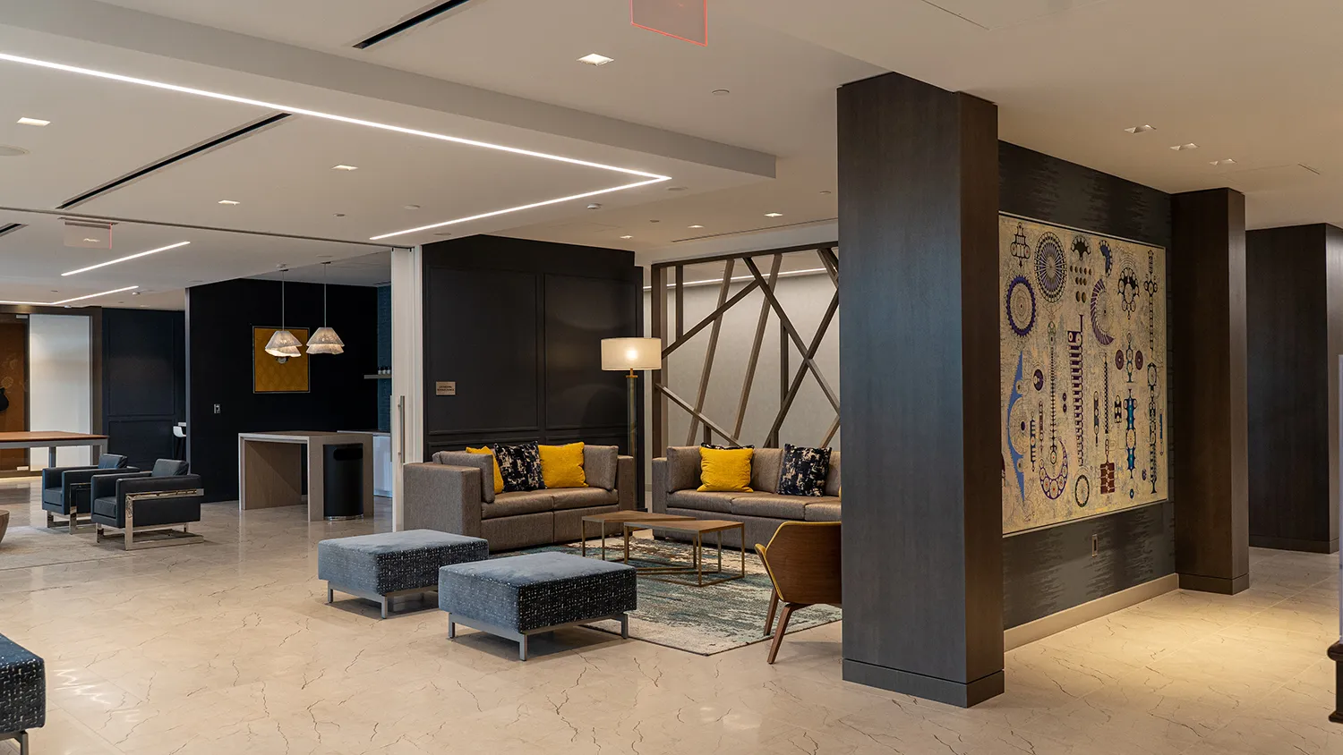 — Modern lobby with expansive art wall