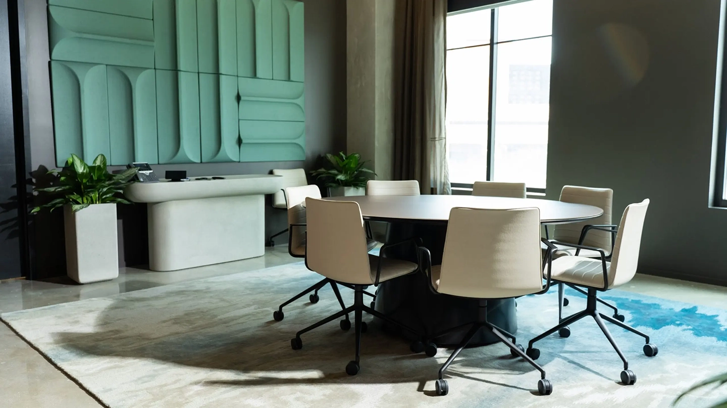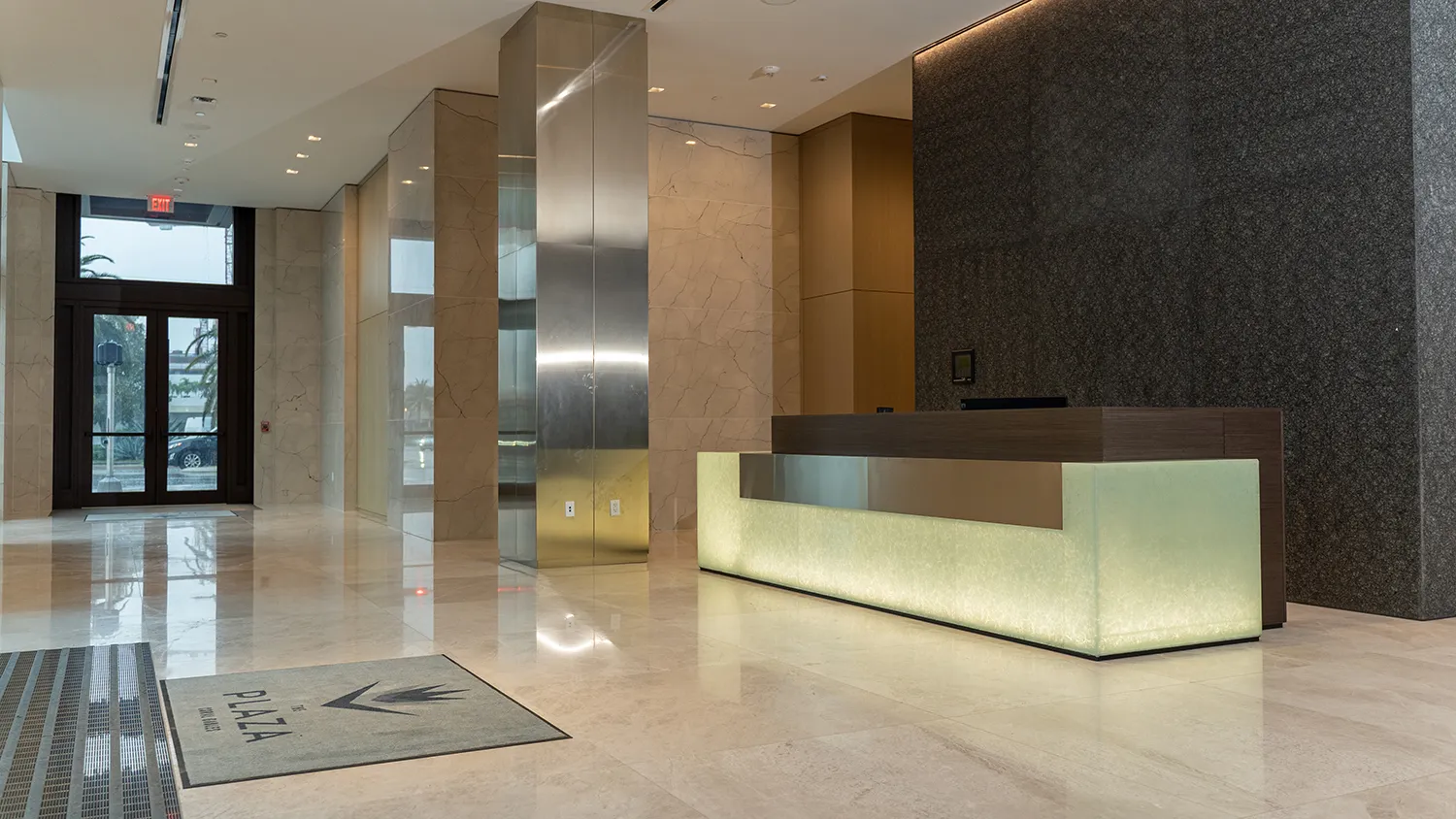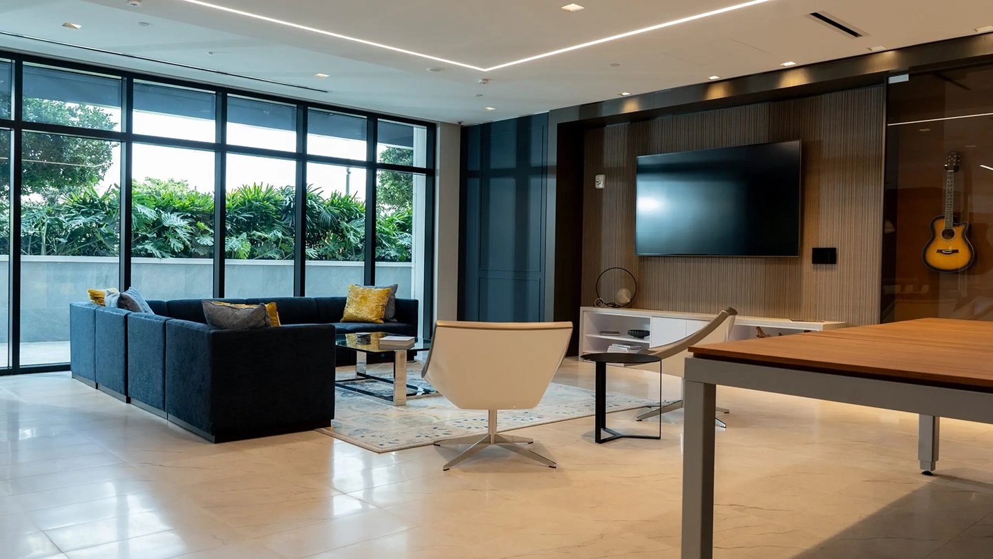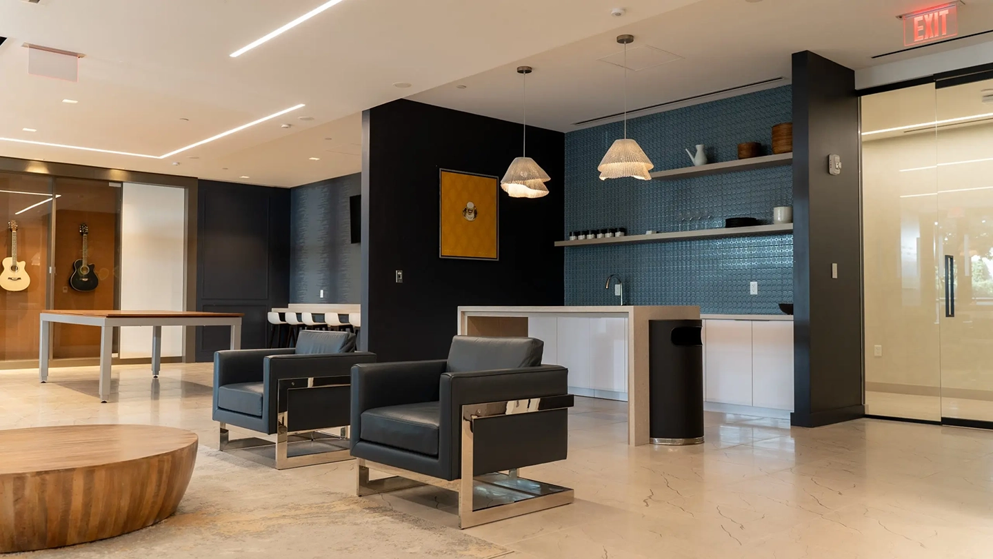 — Modern lobby with expansive art wall